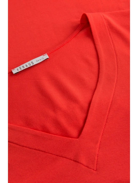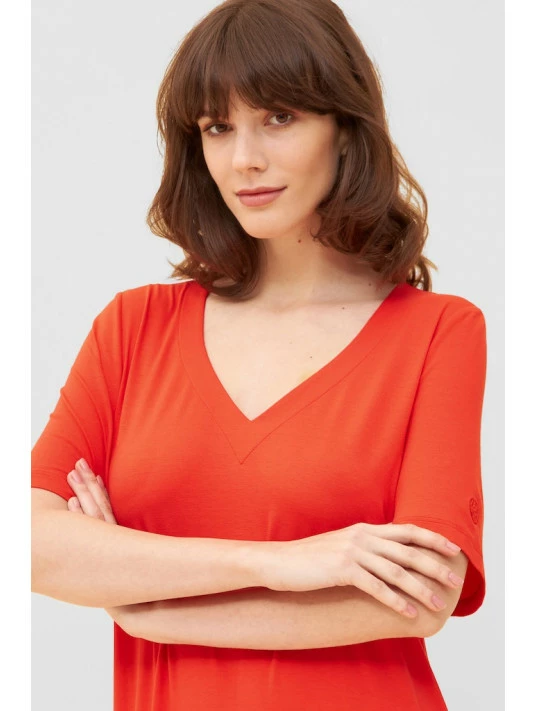 Chemise de nuit longue, col v, manches courtes rouge orangé de la marque Féraud.