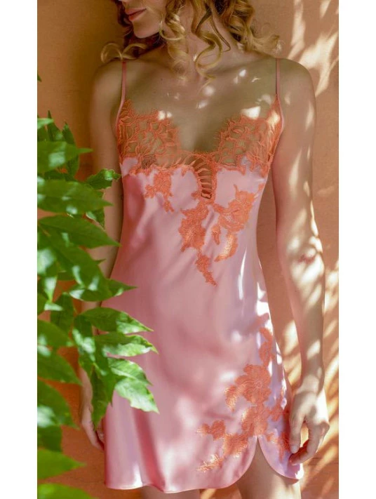 Réalisée en satin de soie rose, la combinette Nymphe est rehaussée d’une magnifique dentelle couleur abricot.