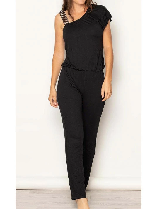 Cette combinaison en viscose ultra douce possède un design original associant un haut unique avec un mancheron court d’un côté et une bretelle aux résilles graphiques à l’autre épaule, assemblé à un superbe pantalon à la coupe plutôt droite et légèrement ample pour un confort sans pareil.