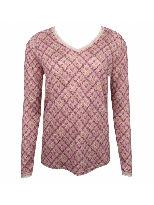 Décolleté V tout en maille imprimée avec incrustation dentelle sur le décolleté devant et les bas de manches.