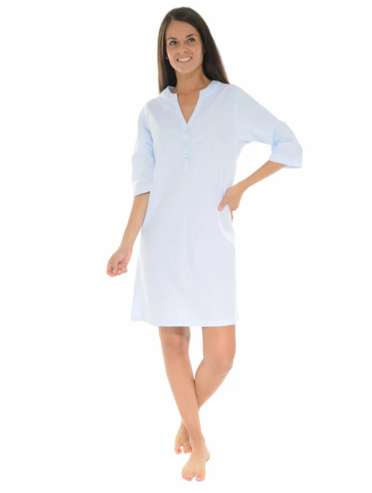 Cette liquette manches longues à rayures blanches et ciel comporte un joli col tunisien avec ouverture par 3 boutons afin de l’ajuster selon vos envies.