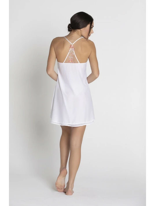 Nuisette à bretelles fines légèrement évasée sur le bas. Longueur mi-cuisse.