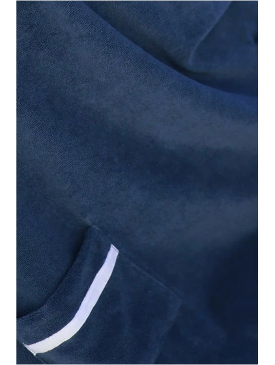 Deux poches sont confectionnées sur l’avant ton sur ton et possèdent un léger liseré blanc sur le haut de la poche qui fait ressortir la belle couleur bleu marine du modèle.
