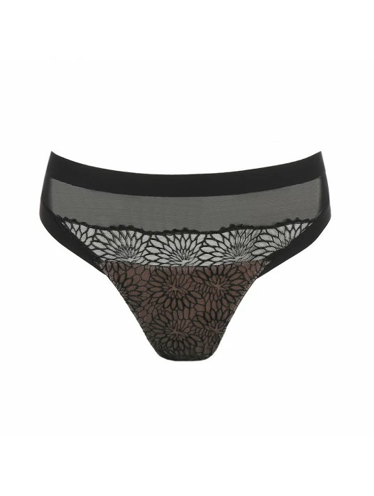 Un slip brésilien glamour orné d’une broderie noire posée sur du tulle couleur chair.