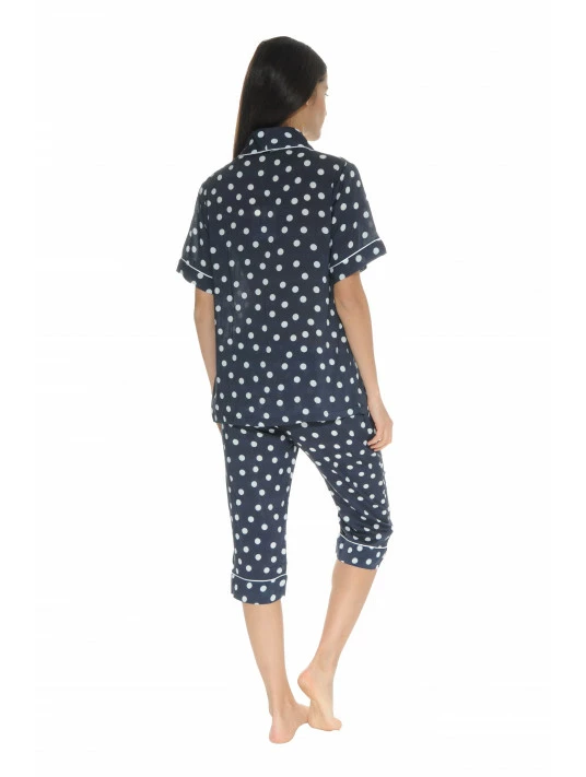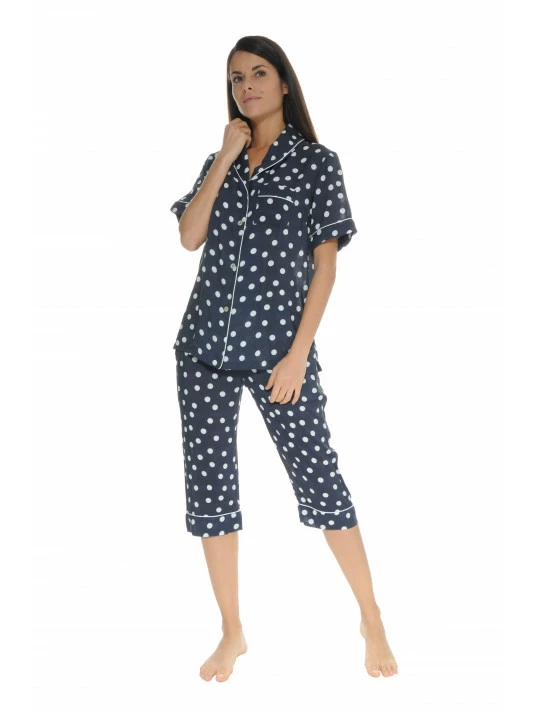 Marine à pois blanc pour rester dans le classique et l’élégance, ce pyjama vous apportera tout le confort donc vous aurez besoin chez vous.