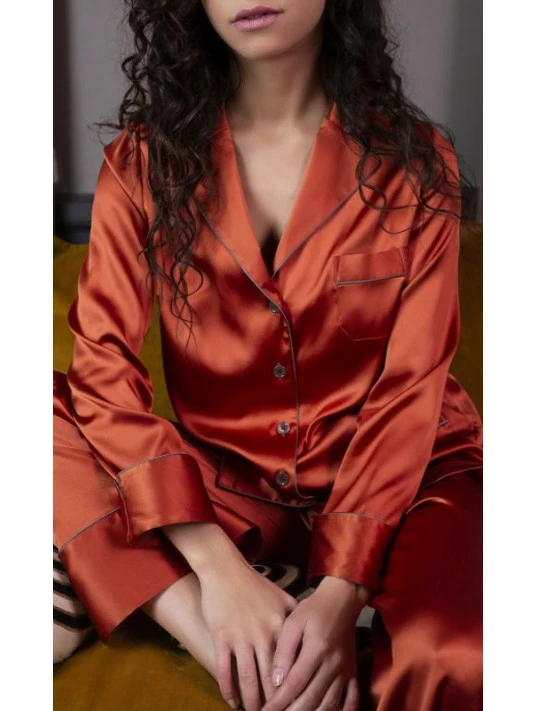 Ce pyjama de la collection Noane est fabriquĂ© dans un doux satin de soie mĂ©langĂ©e relevĂ© d’un passepoil contrastĂ©.