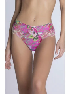 Modèle en tulle imprimé avec une découpe élancée au devant, agrémenté de galon festoné brodé multifils aux cuisses devant, ainsi qu’un médaillon trianglulaire à la taille milieu dos.