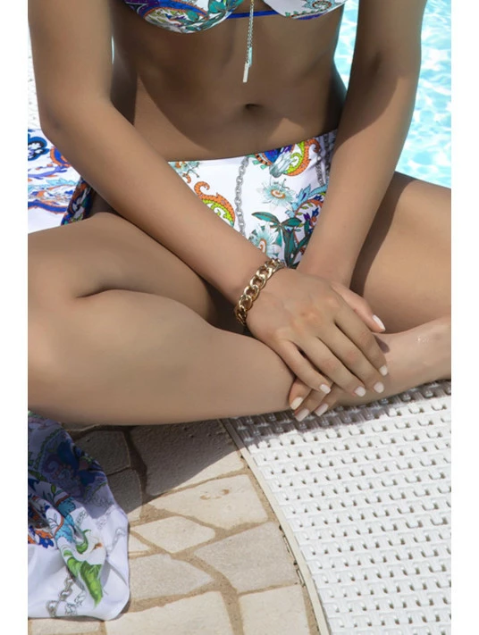 Les formes sont sublimées par de fines chainettes entre-croisées. La maille nerveuse Certifiée Lycra Beauty a effet légèrement gainant du corps.